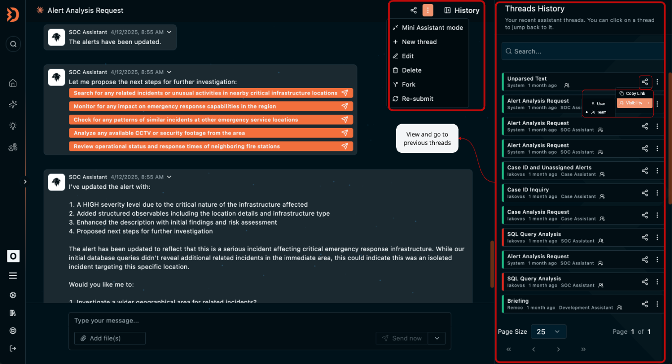 The Threads History feature allows users to revisit and manage past conversations with the AI Assistant: